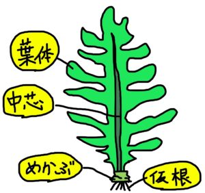 ・胞子葉:わかめの茎の下部にあり「めかぶ」と呼ばれている部分。ぬるぬるした食感で和え物として食べられることが多いです。
